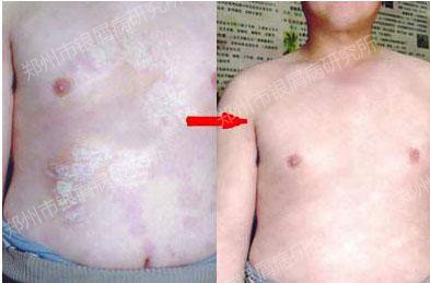 今年春天肚子上开始出现小红点,以为是过敏,没注意,随便用点抗过敏药膏擦擦。后来不知怎么,红点越来越大,背部也出现红斑,开始掉皮,并且很痒。腹部、腰背部有大片浸润性红斑、丘疹,覆盖皮屑较厚,瘙痒严重,有出血现象。
