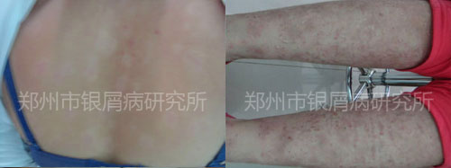 患者初诊时,全身多处泛发皮损,尤其是腿部,皮损严重