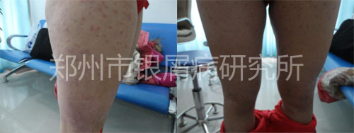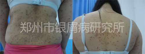 病史:患者患病7余年,伴有皮损鳞屑,中间有3年病情好转。外用自制药水,疗效不佳,四处寻医,都不见效果,后来病情也逐渐加重,今来我院治疗。